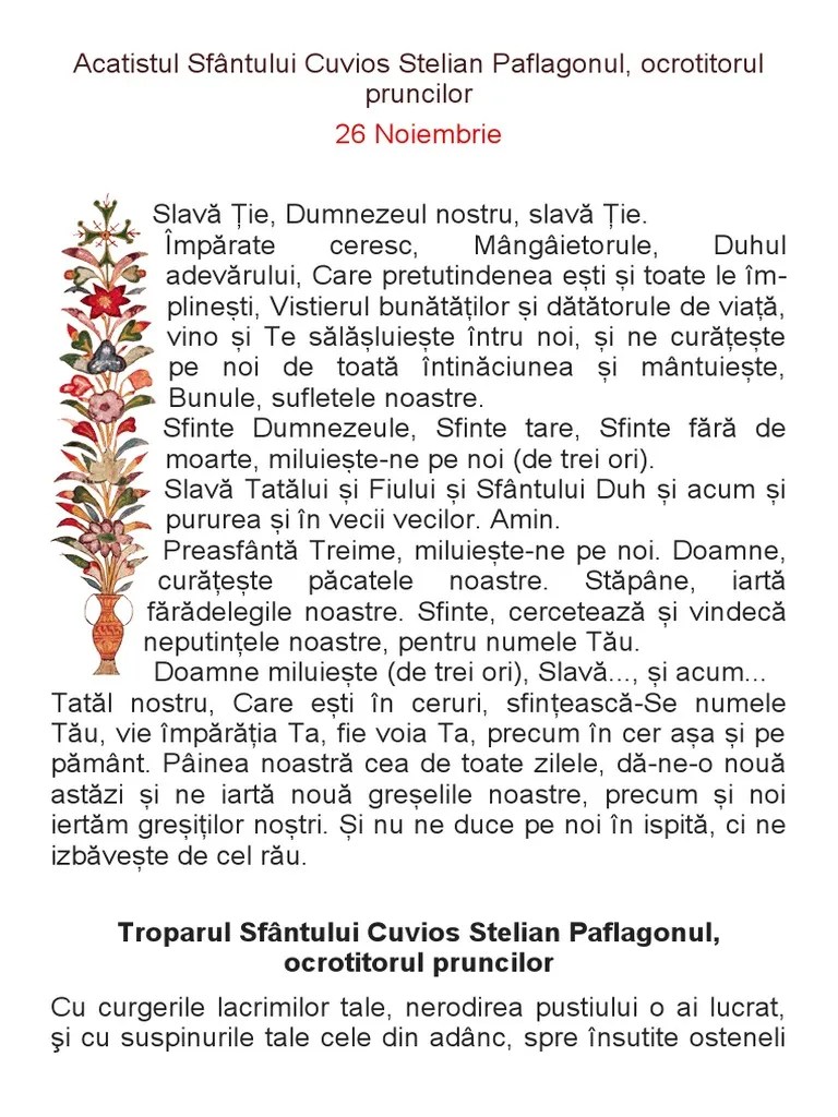 Rugăciune către sfântul cuvios stelian, ocrotitorul copiilor şi al mamelor. Acesta îi ocrotește pe copii și familiile lor care se roagă cu dragoste. Totodată, această rugăciune le este de folos și femeilor însărcinate dar și celor care nu pot avea copii. Sfântul stelian este între sfintii zilei, cinstiti de credinciosii ortodocsi, conform calendarului ortodox 2018, pentru data de 26 noiembrie. Viața sfântului cuvios stelian paflagonul. Din viața sa aflăm că o femeie care îl ajuta la îngrijirea copiilor, nu putea să aibă copii.